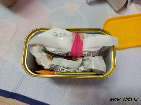 일단 베이킹 재료들은 큰 스팸 통에 담았고, 무스비 만들때는 이쑤시개 담긴 스팸 통을 사용하기로 했어요.