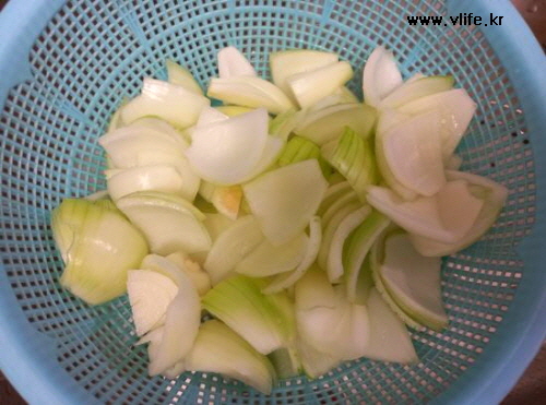 양파의 매운맛을 빼고 싶어 물+소금, 설탕 약간 녹여 먹기 좋게 썬 양파를 30여분 담가 두었어요.