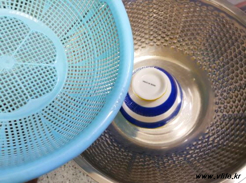 양푼 안에 작은 그릇 엎어 놓고 채반 올린 뒤