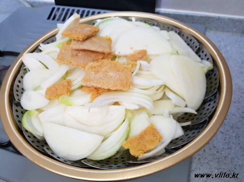 김 오른 찜기에 양파 깔고 간 생강이라 채반 구멍으로 빠질까 봐 양파 위에 얹어서 2~3분 쪘어요.