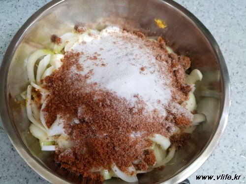 설탕이 완전히 녹았고 양파가 쪼글쪼글해졌어요.