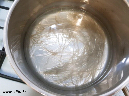익히는 시간 줄이려고 당면을 미리 물에 불려 끓는 물에 익도록 삶아
