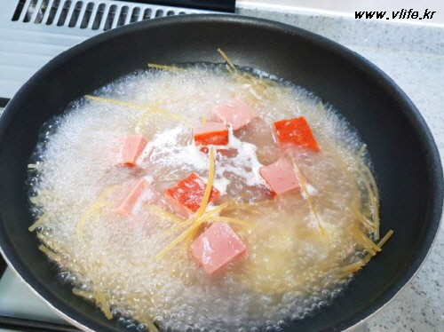 면수는 햄도 삶아진 물이라 꺼림칙해서 약간의 생수 넣고 촉촉하게 볶았어요.