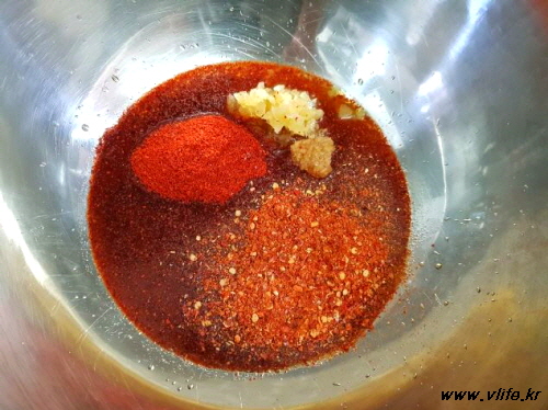 액젓(혹은 간장과 액젓을 섞어서)에 고춧가루(고운 것, 거친 것. 있어서 넣었어요)와 설탕 대신 양파청, 마늘, 생강청(생강) 넣어 골고루 섞어요.