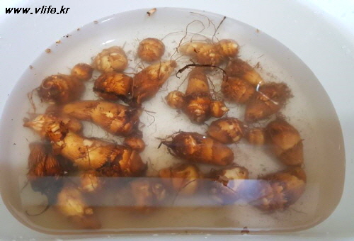 미끄덩거림 없어지게 쌀뜨물에 하룻밤 담가 깨끗이 헹궈