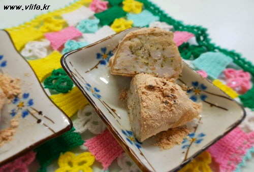 준비물; 토란, 라이스 페이퍼, 콩가루나 미숫가루, 검은깨, 치즈가루, 설탕, 쌀뜨물