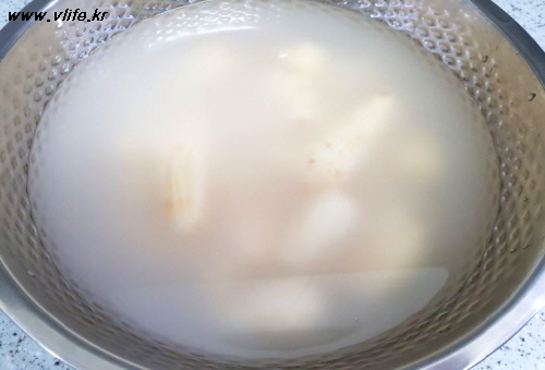 미끄덩거림 없어지게 쌀뜨물에 하룻밤 담가 깨끗이 헹궈