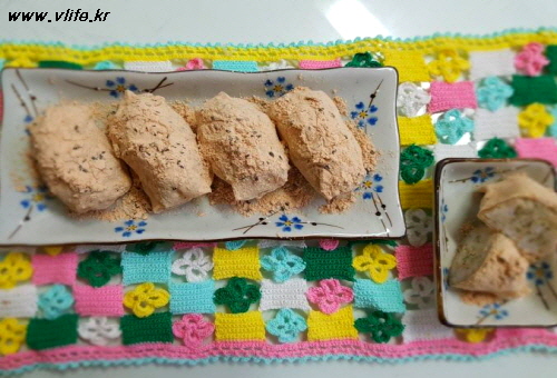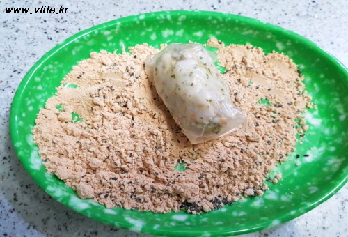 콩가루 있으면 사용하고 저는 미숫가루에 설탕+검은깨 섞어 입혔어요.