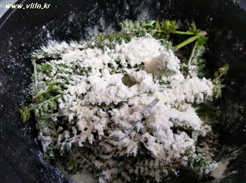 들깨 송이에 물기 있는 상태에 튀김 가루 넣어 골고루 묻혀