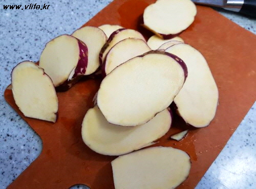 고구마를 껍질 채 깨끗이 씻어 적당한 두께로 썰어요.