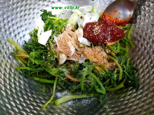 준비물; 나물 - 당근 잎, 고추장, 설탕, 소금, 파, 마늘, 깨소금, 참기름