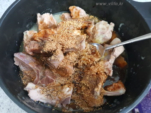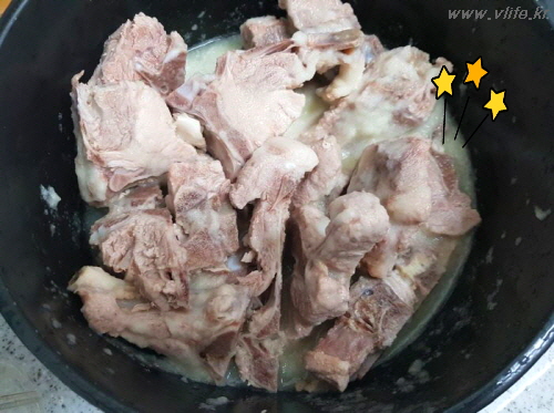 뒤적이며 뼈에서 살이 스르르 떨어질 때까지 푹 끓여요.