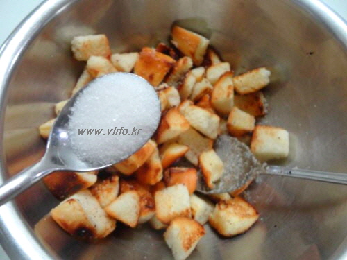 식기 전에 설탕 넉넉히 뿌려 골고루 뒤적여 단 맛을 입혀요.