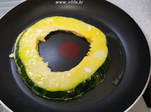 큰 접시에 달걀 풀어 호박 앞 뒤에 골고루 바르고