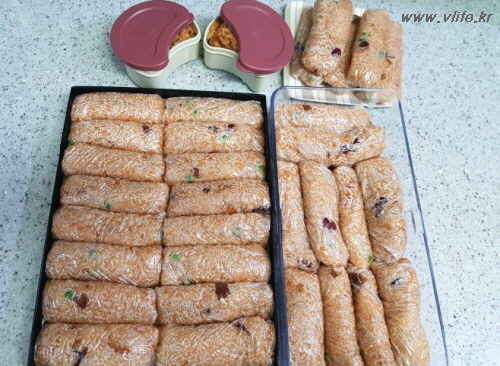 더 편하게 한다면 넓적한 쟁반에 약밥을 고르게 펴서 칼로 1인분 씩 나누어 잘라 랩에 말아요.
