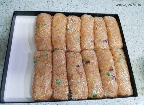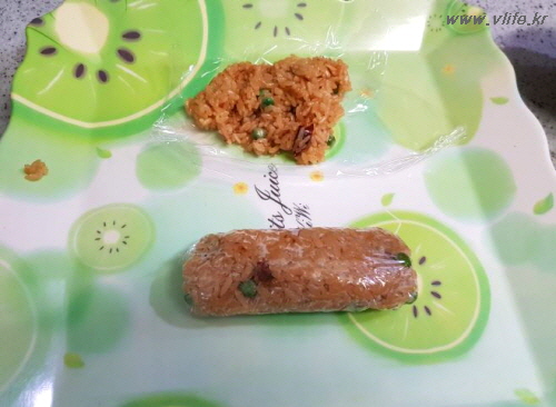 랩을 적당한 크기로 잘라 숟가락으로 1인분씩 담아 (숟가락 두 개 양 손으로 나누어 쥐고 물 묻혀 가며 하면 편리) 랩을 돌돌 말아요.
