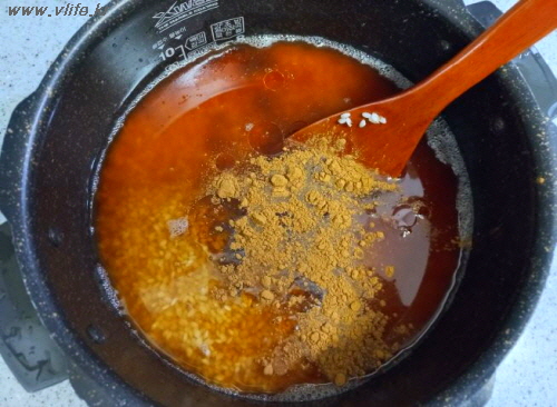 불린 쌀 넣고 쌀의 윗면이 보일락 말락 하게 물 붓고(이번에 만들 때는 물이 좀 많이 들어가 찹쌀 추가했어요. 이런 실수를 하다니-- ㅜ) 흑설탕과 간장