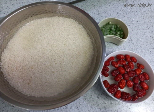 준비물; 찹쌀, 완두콩, 대추, 간장, 흑설탕, 참기름, 계핏가루