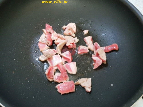 약간의 돼지고기를 식용유 조금 두르고 겉면이 하얗게 될 때까지 볶다가
