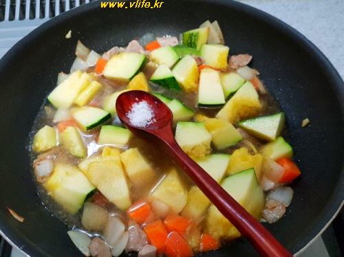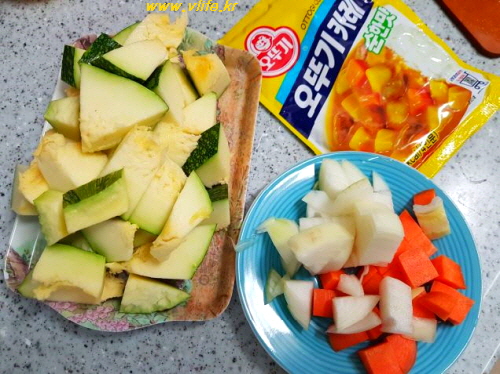 준비물; 호박, 돼지고기, 양파, 당근, 마늘, 카레, 소금, 식초, 식용유