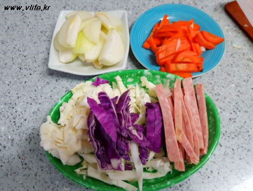 준비물; 양배추, 햄, 양파, 당근, 간장, 참기름, 깨소금, 후추, 식용유