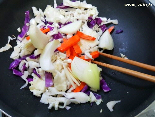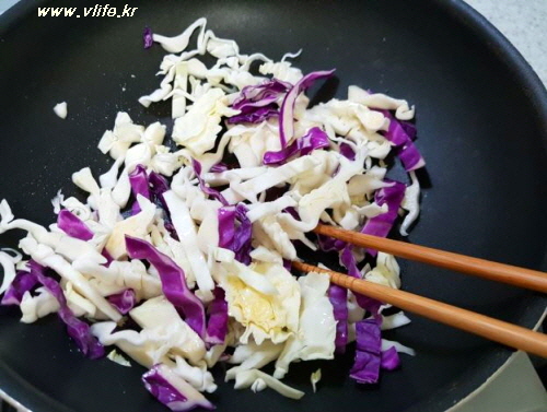 식용유 두르고 양배추 볶다가 가장자리가 투명해지기 시작하면