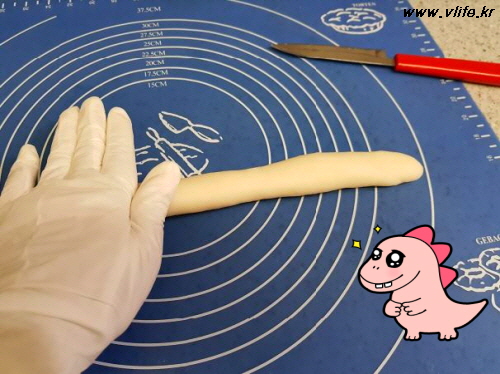 뜨거우니까 장갑 속에 면 장갑 끼고 반죽을 최대한 많이 치대고 주무르고 누르고 많이 많이 해요.