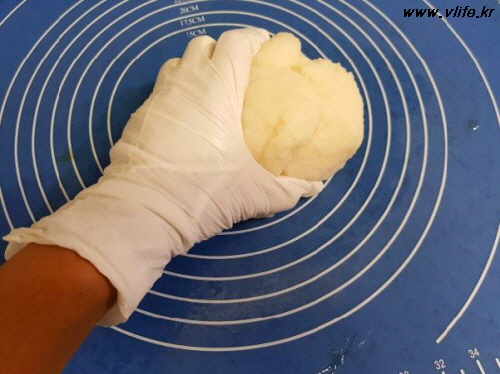 뜨거우니까 장갑 속에 면 장갑 끼고 반죽을 최대한 많이 치대고 주무르고 누르고 많이 많이 해요.