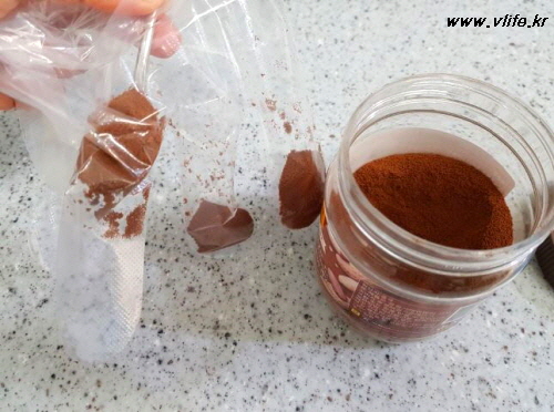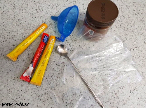 빈 일회용 커피 봉지나 일회용 비닐 장갑, 깔때기가 없으면 종이나 호일로 대충 만들어 사용해요.