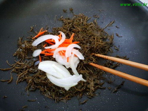 녹차 잎 나물은 향이 강한 마늘과 파는 넣지 않고 양파와 당근만 조금 준비했어요.