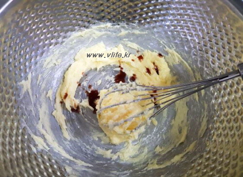 실온에서 말랑해진 버터 풀고 설탕 넣고 젓고 달걀 두세 번 나누어 부으며 섞어요.