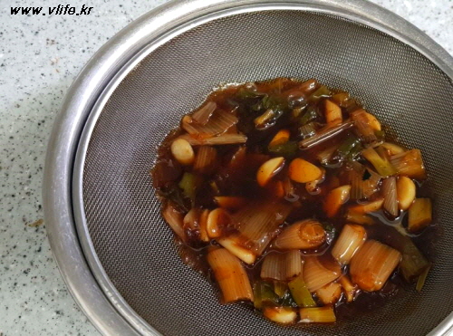 꾹꾹 눌러 가며 채에 국물만 걸러 식혔어요.