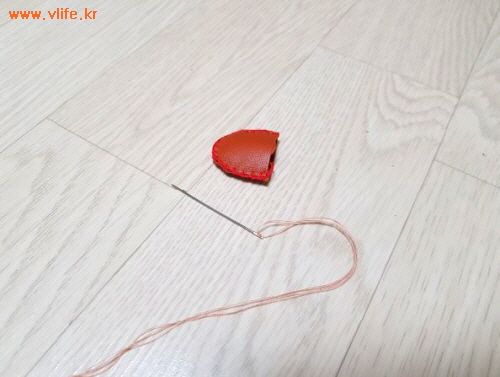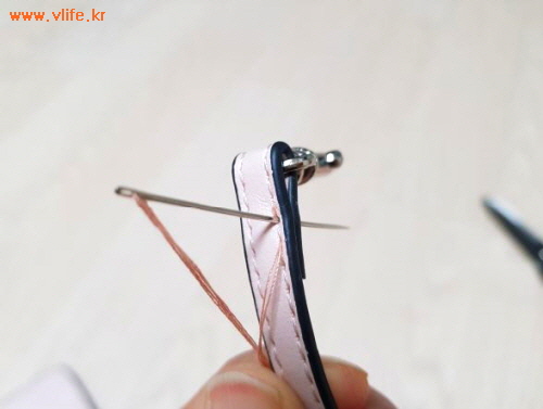 실도 최대한 비슷한 색 찾아 튼튼하게 두줄로 했고, 가죽이라 바늘이 잘 안 들어가니 골무는 필수템이에요.