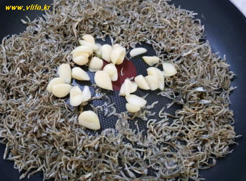 멸치를 채반에 담아 흔들어 부스러기 털어 내고, 팬은 주방 티슈로 닦아 정리해서 다시 멸치와 마늘, 기름 둘러 튀기듯 바삭하게 볶은 뒤