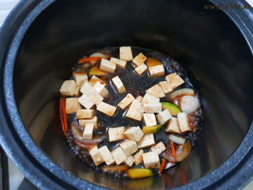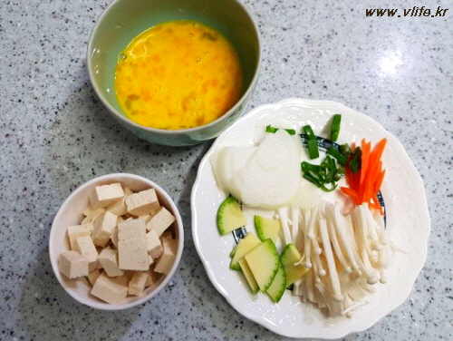 준비물; 두부, 달걀, 양파, 당근, 파, 호박, 팽이버섯, 간장, 설탕, 후추, 전분, 참기름, 식용유