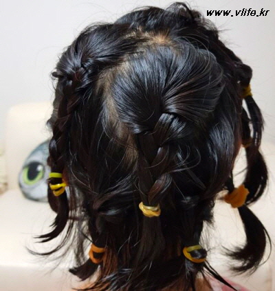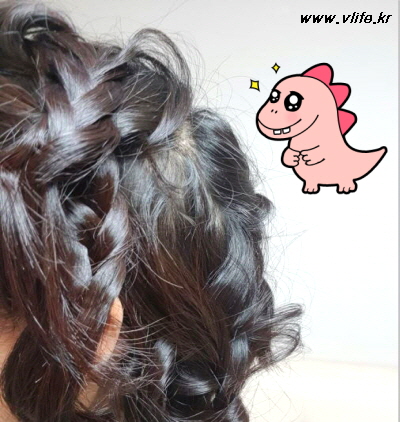 최대한 조금씩 잡고 위에서 부터 촘촘하게 머리카락 끝까지 땋고 싶었으나 왼쪽 팔이 아파 사진만큼 땋기도 겨우겨우 ㅜ