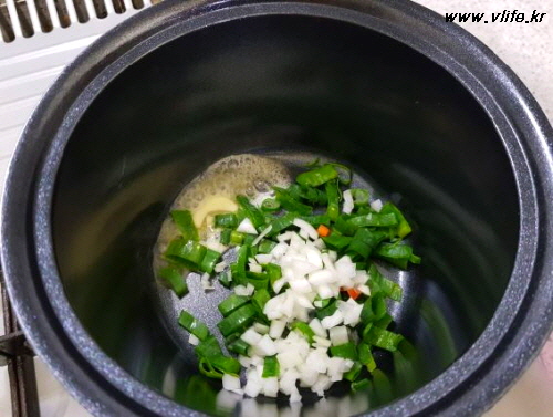 버터 녹기 시작하면 파와 당근 넣어 충분히 볶아 향을 내요.