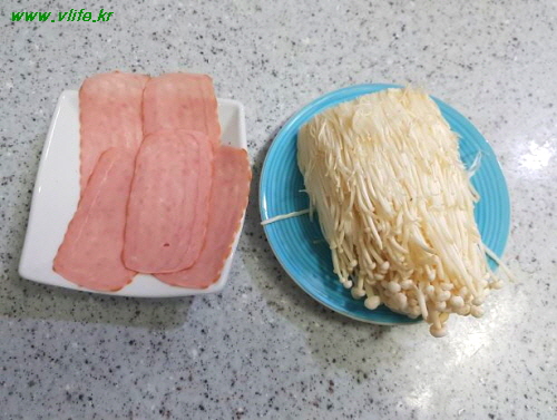 준비물; 팽이버섯, 슬라이스 햄, 파, 소금, 후추, 참기름, 식용유