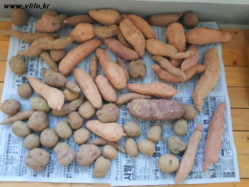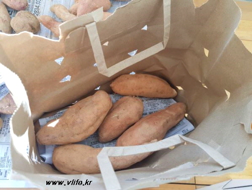 고구마나 감자 한 층 깔고 신문 덮고를 반복.