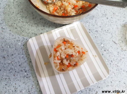주먹밥 틀(손으로 꽉꽉 힘주어 뭉치거나)에 눌러 담고