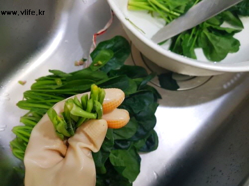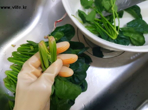 뿌리까지 먹는 게 더 좋고 시든 잎은 떼어 버리면서 잘잘한 시금치는 그냥 다듬고