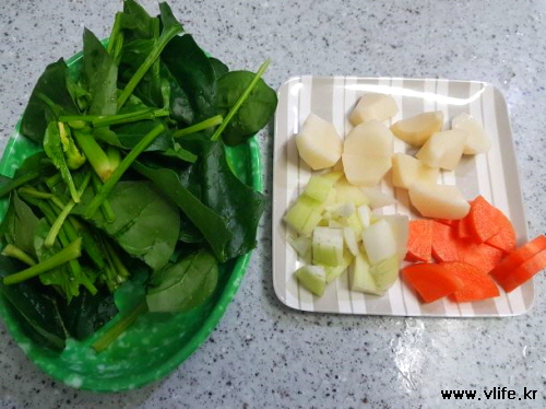준비물; 밥, 시금치, 감자, 양파, 당근, 카레, 식용유