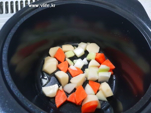 식용유 조금 두르고 감자, 당근 잠깐 볶다가 양파 넣고 볶다가(나는 양이 얼마 안돼 한 번에 볶았어용 ㅎ)
