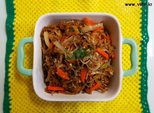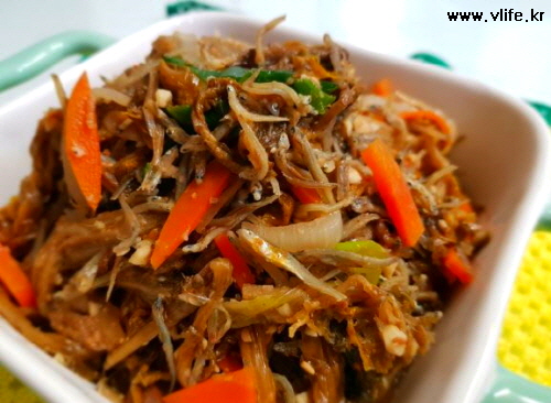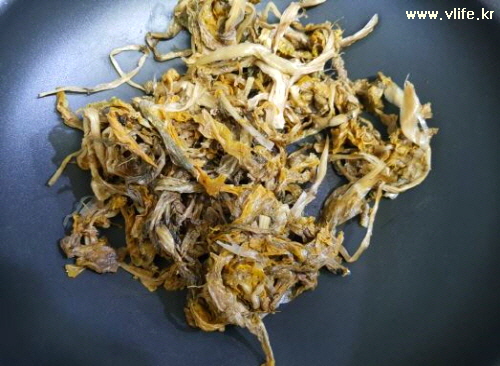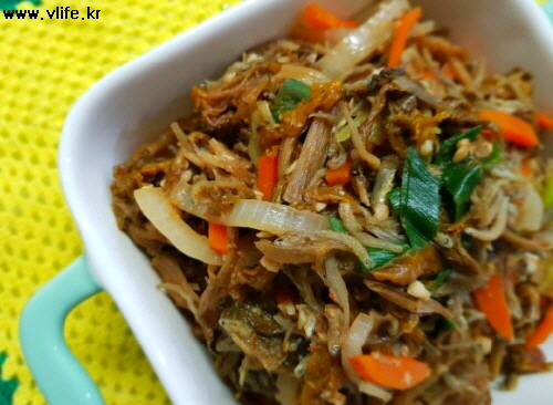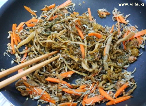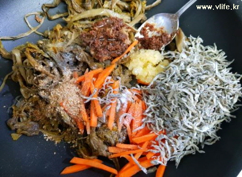 준비물; 시래기, 멸치, 당근, 파, 양파, 마늘, 된장, 참기름, 후추, 깨소금, 설탕, 식용유