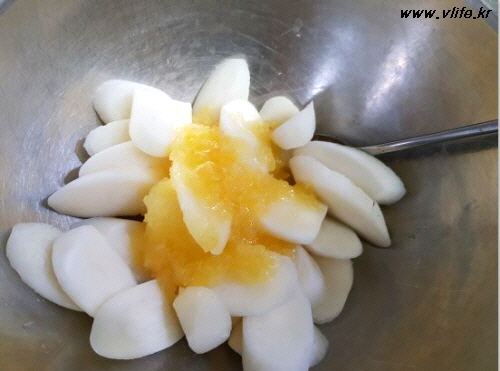 꽁꽁 얼어 있던 떡은 실온에 두어 완전히 녹여 마늘버터 넣고 버물버물