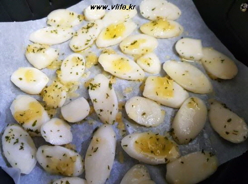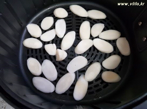 에어프라이어 용기에 기름종이 깔고 겹치지 않게 올리고 200도에서 10분 정도 돌리며 중간에 한번 뒤집어 주고 기계마다 다르니까 마지막 몇 분 남기고는 자주 확인해요.