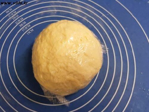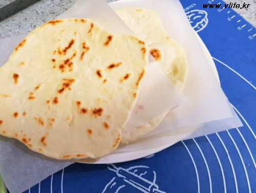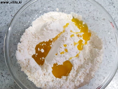 준비물; 중력분 350g, 올리브 오일 3큰술, 따뜻한 물 190ml, 소금 1작은술, 베이킹파우더 1.5작은술