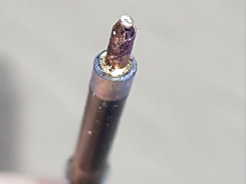 상황: 잉크가 남아 있는 볼펜의 앞부분, 쇠로 된 볼펜심의 제일 앞에 있는 동그란 구슬(글씨 쓰면 구르며 잉크가 나오게 하는)이 망가졌어요.