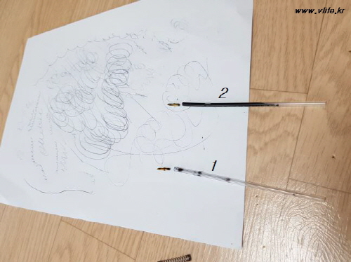 1번이 다 쓴 볼펜, 2번이 볼이 망가진 볼펜