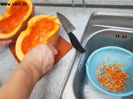 (이 호박은 덜 영근 건지 씨가 꽉 차지 않아 몇 개 못 먹었어요)